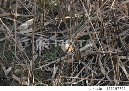 草原の枯草にとまって当たりの様子を伺っているホオアカ