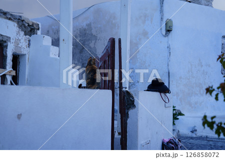 Cozy Cycladic-style courtyard on Santorini island. Flowers in blue pots and lush bougainvillea