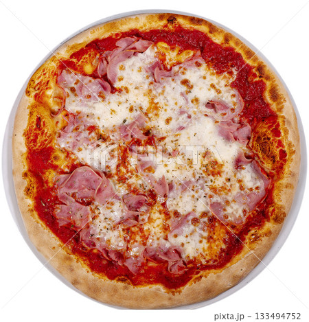 Pizza with prosciutto parma ham on wooden background top view. Italian cuisine