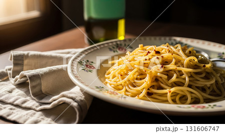 Traditional Aglio e Olio Spaghetti in Vintage Floral Plate