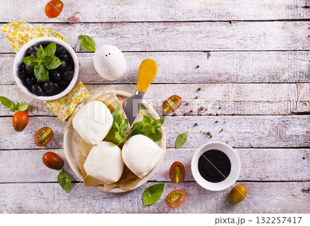 Mozzarella cheese balls, fresh white mini slices for Mediterranean food. Mozzarella cheese