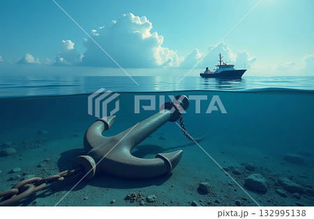 Ship yacht on surface of ocean water, sea anchor lies underwater. AI Generative