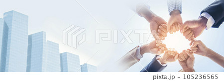 Banner Partners hands together teamwork group of business people meeting in firm company office. Panorama Diversity Hands join empower partner teams connection Mergers acquisitions social community