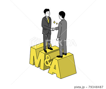 握手するビジネスパーソンとM&Aの文字、黄色とグレーのシンプルイラスト、ベクター