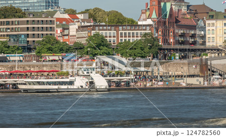 Timelapse of a ferry entering and exiting the Hamburg port terminal, with passengers on the pier and moving on stairs.