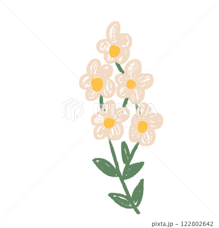 Flower crayon drawn. Spring plant doodle isolated on white background. Summer floral kids element. Chalk or pastel style childish scrawl nature shape. Vector naive illustration by pencil