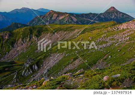 北アルプス・双六岳から見る夜明けの笠ヶ岳と乗鞍岳・御嶽