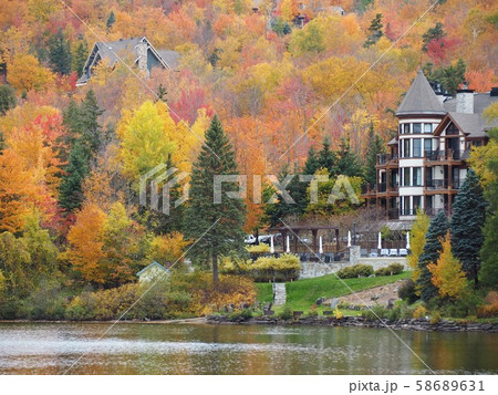カナダ・ケベック州のモン・トランブランの湖畔のリゾートと紅葉
