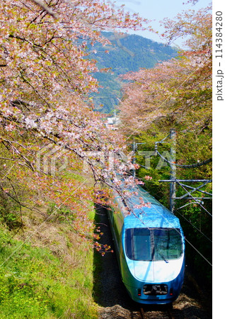 山北の桜並木を行く小田急ロマンスカー(60000形 MSE)