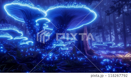 A clearing in the bioluminescent forest glows with radiant blue fungi, creating an inviting, mystical aura.