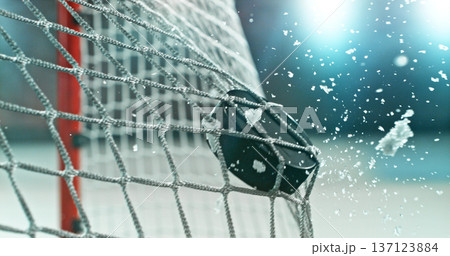 Action sports photo of a hockey puck flying into the goal net during a scoring shot, with ice particles in the air, capturing speed and intensity.