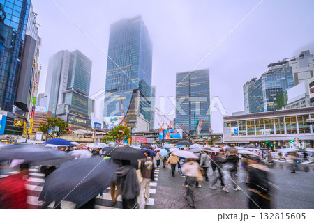 日本の東京都市景観日照不足続く…雨の中、横断を楽しむ外国人観光客で溢れるスクランブル交差点=26日