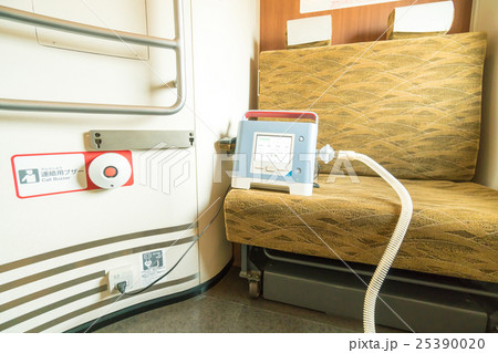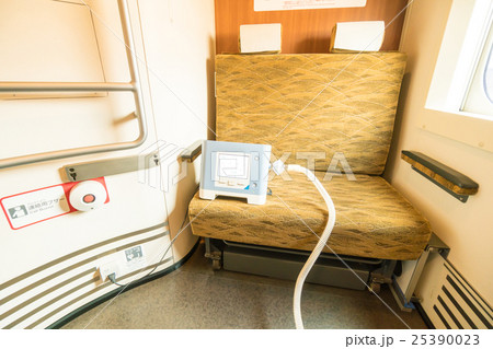 新幹線の多目的室で人工呼吸器をコンセントに接続して使用するイメージ