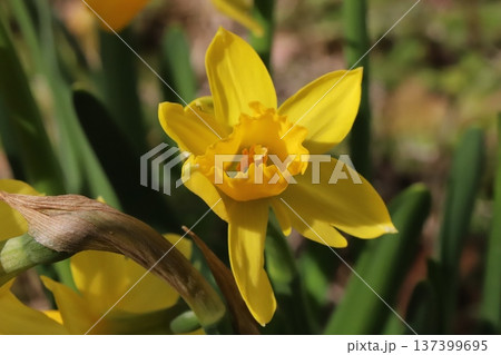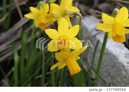 早春の庭に咲く黄色いミニ水仙(テターテート)の花