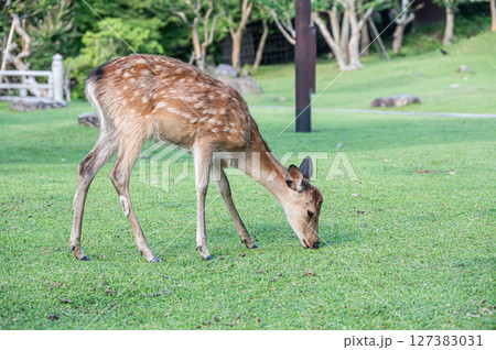 奈良国立博物館前で草を食べる鹿