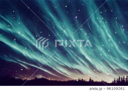 Illustration a beautiful milky way star and green aurora dancing over the mountain.