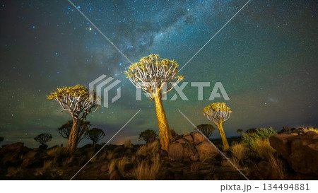 Quiver Tree Forest night landscape under Milky Way stars in Keetmanshoop Namibia, illuminated Kokerboom trees with galactic core and green airglow over rocky desert terrain.
