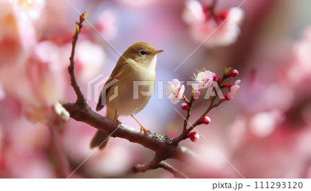梅とウグイス:満開の梅花の枝にウグイスが留まっている