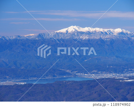 八ヶ岳・天狗岳から望む冬の乗鞍岳と諏訪湖