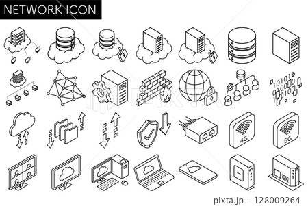 ネットワークのイメージイラスト、クラウドやサーバー・セキュリティ対策のアイソメトリック線画アイコン