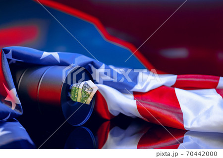 Barrel of oil on a background, american dollars background. Word on barrel is Oil. Falling trend of barrel price decrease of earning and global economics . Selective focus.