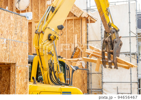 木造住宅 解体作業 バックホウ グラップル フォーク 油圧ショベル