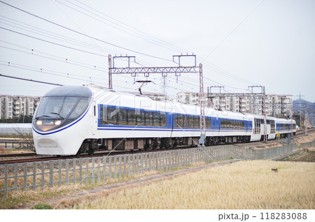 稲刈りの終わった田んぼを走る小田急ロマンスカーGSE特急電車