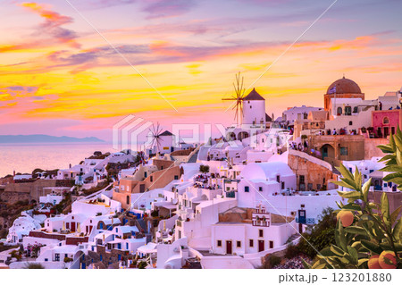 Sunset over Oia town on Santorini island in summer. Santorini, Greece