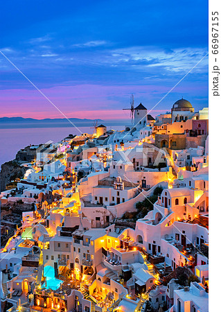 Famous greek iconic selfie spot tourist destination Oia village with traditional white houses and windmills in Santorini island on sunset in twilight, Greece