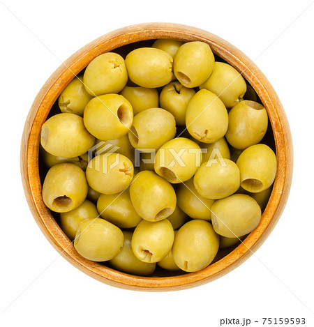 Pickled and pitted small green table olives in a wooden bowl. Green fruits of Olea europaea, unripe picked, cured and fermented before preservation. Closeup from above isolated over white food photo.