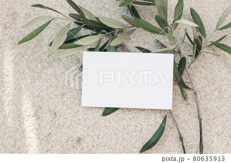 Summer stationery mockup scene,. Blank business card on concrete floor. Textured background with olive tree branch. Mediterranean design. Branding concept. Flat lay, top view, no people.