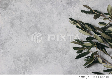 Floral composition of green olive tree leaves and branches isolated on grunge gray table background. Botany styled stock flat lay image, top view. Copy space, no people. Summer natural frame.