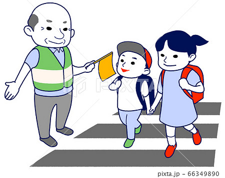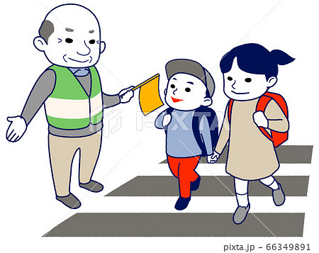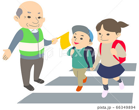 横断歩道を渡る小学生と地域ボランティアの男性のイラスト