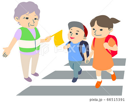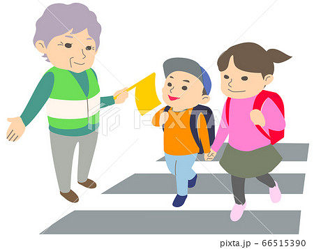 【マスク無】横断歩道で小学生の通学を見守るおばあさん - 主線なし・長袖・春・秋・冬