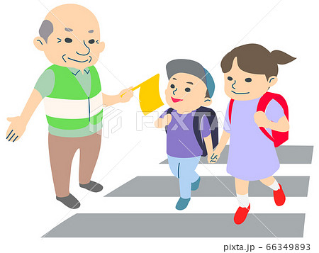 【マスク無】おじいさんに見守られながら横断歩道をわたる小学生の男の子と女の子 - 主線なし