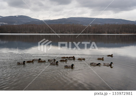 Flock of Ducks Swimming on Calm Lake with Mountain View stock photo