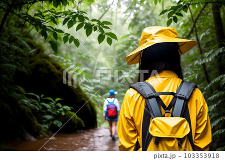 Women travelers in yellow and blue panamas and raincoats with backpacks walking on tropical jungle trails. Generative AI