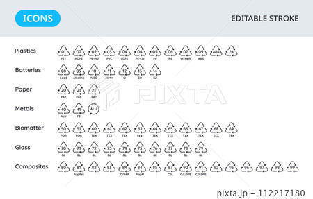 Recycling codes icons. Ecological materials symbols. Identification of signs for packaging. Collection of elements on a white background. Editable stroke.