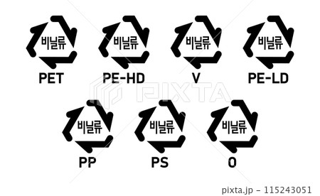 South Korean plastic recycling code icon set 01-07. Set of Korean plastic recycling code symbol icons PET, PE-HD, V, PE-LD, PP, PS, O. South Korean plastic recycle marks 1-7 vector illustration.