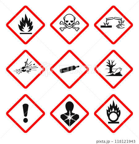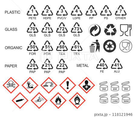 Packaging icon symbol set. Package logo sign collection. GHS pictograms. Recycling codes. Vector illustration. Isolated on white background.