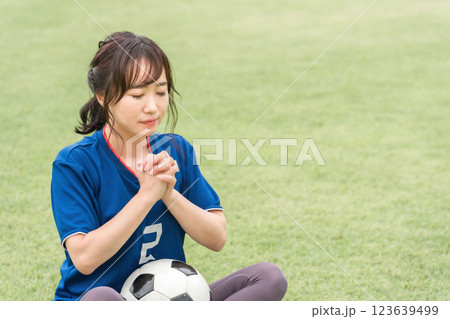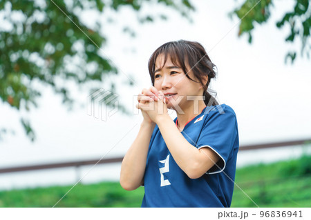 祈るように応援するサッカーファン・サポーターの日本人女性