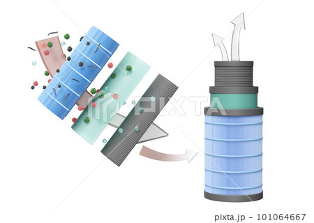 3d 3-layer round air filter for filtering dust, PM.5, virus, odor, arrow air flows shows, prevents vapors and odors from chemicals, virus, allergen, 3d render illustration, isolated
