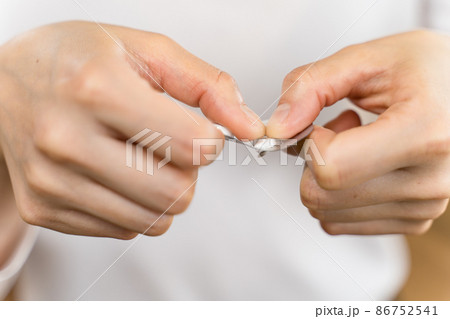錠剤のPTP包装パッケージを手に持つ若い女性 パーツカット