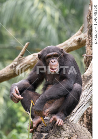 A chimpanzee or Pan troglodytes sitting on a rock, holding a twig with an expressive face. The primate has black fur and is surrounded by a lush green rainforest. Vertical composition