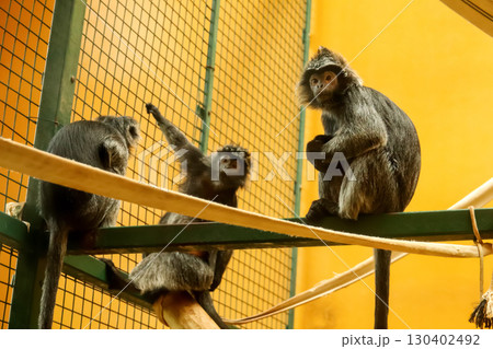 three monkeys in a zoo, with a focus on their playful and a curious nature. three monkeys or chimpanzees in a cage with a yellow background. chimpanzees playful behavior. primate family dynamic