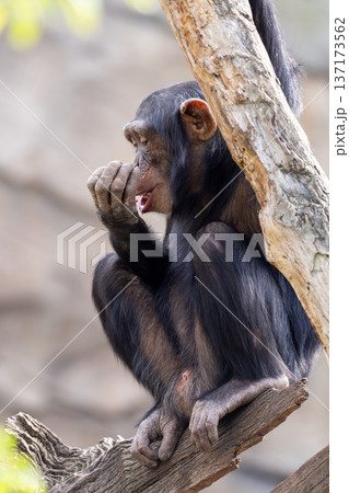 Primate pan troglodytes sitting on branch and touching nose with fingers