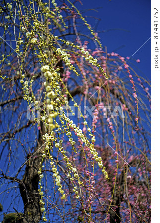 春の青空に咲いた紅白の枝垂れ梅