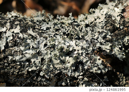 樹皮にビッシリと着生する灰緑色のウメノキゴケ属地衣類の葉状体(自然環境下マクロ撮影)