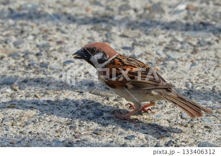 石垣に下りたスズメ(雀)斜め向かいから全身