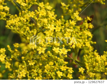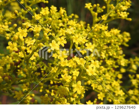 晴れたに中、小さな黄色い花をたくさん咲かせる「オミナエシ」の花頭をマクロ接写撮影。